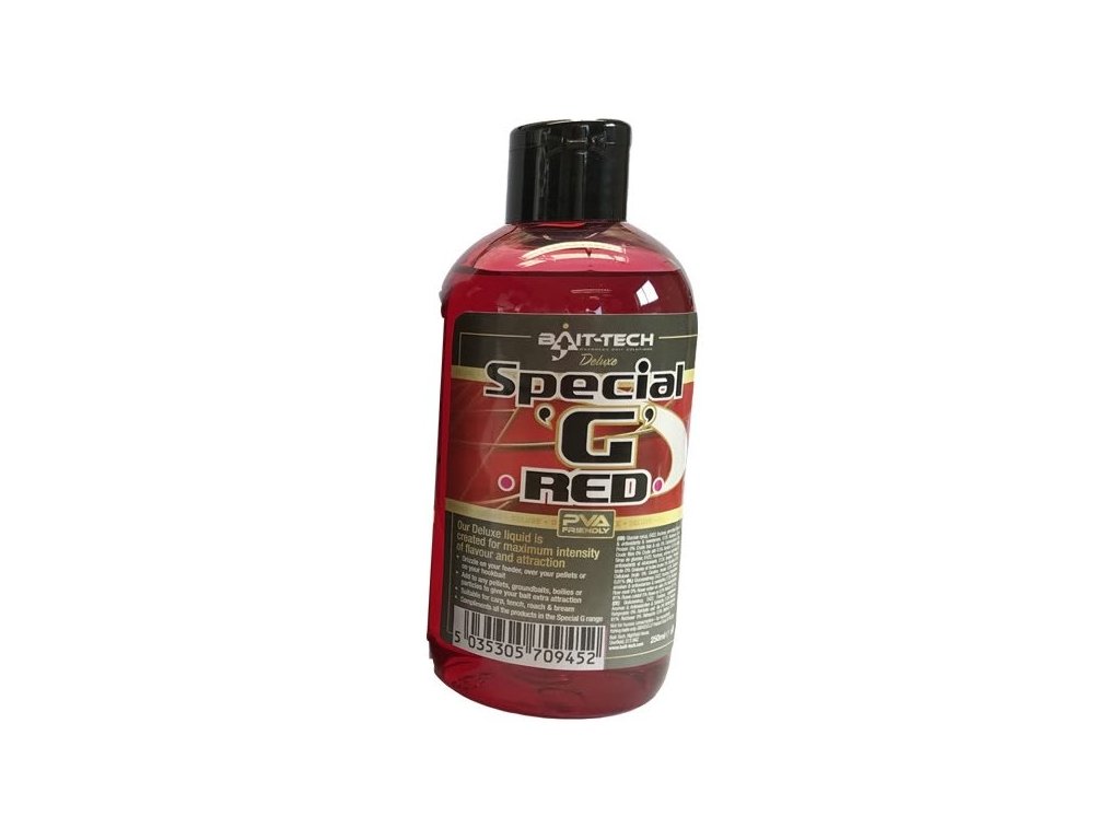 Bait-Tech Tekutý Posilovač Deluxe G Red 250ml - Rad tekutých posilňovačov od Bait-Tech v rôznych príchutiach a na rôzne použitie. Je vhodná do method mixov, spodových mixov a na ľahké dipovanie peliet i boilies.Možnosť využitia je však nekonečná. Pelety, boilies, chlieb, Xpands peletky, červy, je možné ju kombinovať, ako vás napadne. Tento tekutý posilňovač je možné použiť na všetko a všade.