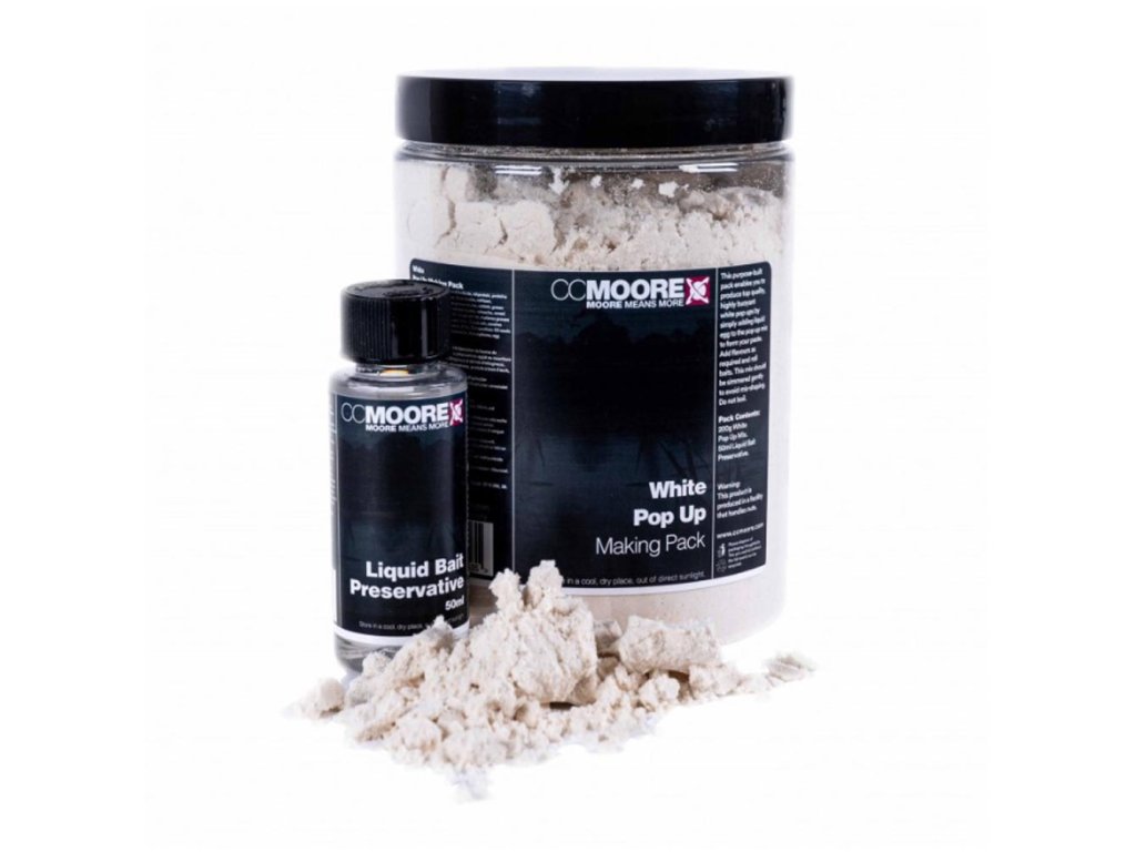 CC Moore Pop up mix Making pack Biela 200g - Toto špeciálne navrhnuté balenie pop-up zmesi vám poskytne všetko, čo potrebujete na jednoduchú výrobu vlastných vysoko účinných fluoro pop-upov a plávajúcich návnad pod háčik. Po zmiešaní s vajcami sa vytvoria pevné, veľmi nadnášajúce návnady a stačí variť len dve minúty, čím sa ušetria straty na atraktoroch počas varenia.