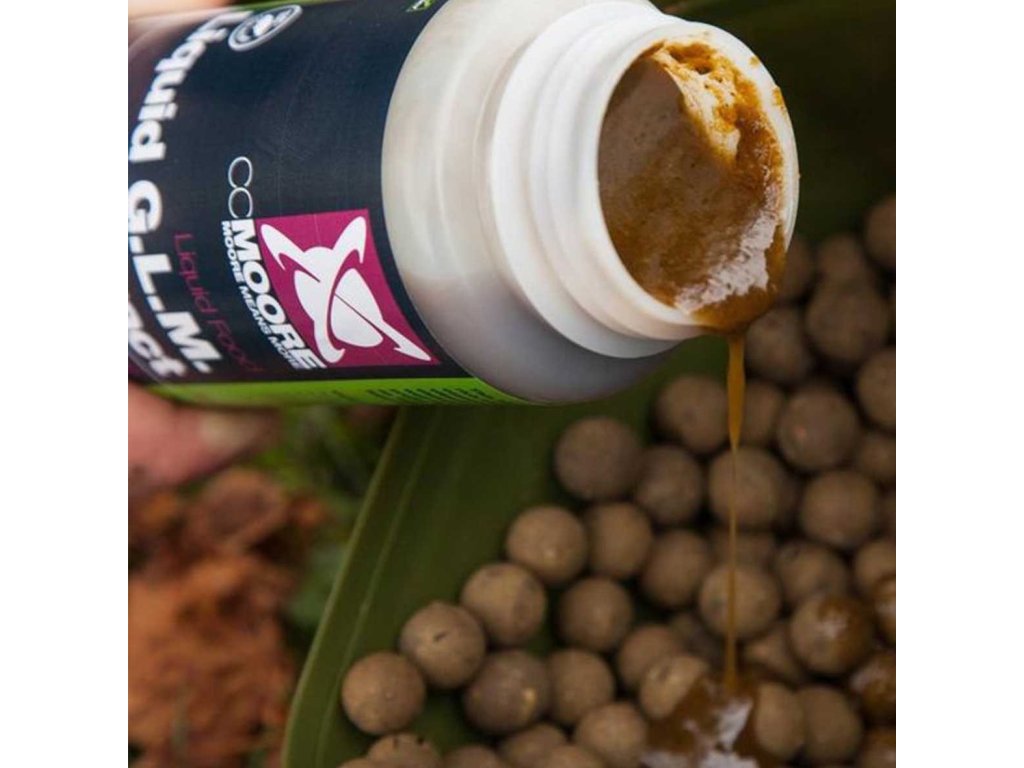 CC Moore Tekutá potrava GLM Compound 500ml - Táto tekutina bohatá na mäkkýše je založená na dvoch najúspešnejších prírodných návnadových „potravinách“ všetkých čias; jemne zmiešané, slané mäso z mušlí a čistý prášok z extraktu z mušle zelených. Spolu so zdravým zahrnutím rozpustného rybieho proteínového extraktu tieto uvoľňujú silné prirodzené spúšťače kŕmenia, ktoré stimulujú silné a sebavedomé kŕmenie.Liquid GLM Compound je vynikajúca celoročná prísada do návnady a je tiež šetrná k PVA.