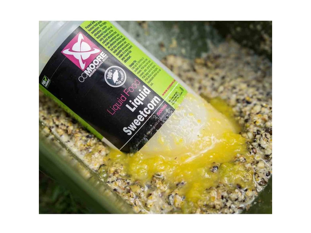 CC Moore Tekutá potrava Liquid Sweetcorn 500ml je tekutá potrava zo sladkej kukurice, so svetložltou farbou, bohatá na prírodné cukry a naplnená zmesou sladkej kukurice v potravinárskej kvalite. Má sladkasto štipľavú chuť a jemnú prírodnú vôňu ako chuť kukurice.Obsah drtenej kukurice zakaluje vodu jemnými čiastočkami potravy, ktoré lákajú ryby kŕmiť sa do oblasti s návnadou. Liquid Sweetcorn je šetrný k PVA a je vynikajúcim celoročnou zálievkou alebo aditívom do rôznych mixov.