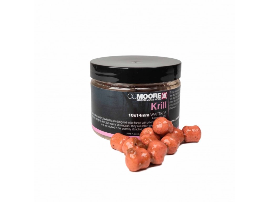 CC Moore Wafters Krill 10x14mm 50ks sú bledo ružové vyvážené wafter nástrahy, pelety o veľkosti 10x14mm zaliate a nasiaknuté s vysoko atraktívnym boostrom Whole Krill Compound. Tieto celoročné návnady sú balené v dózičke po 50 ks, sú vynikajúce pri love s PVA vrecúškami.Krill sú malé kôrovce, ktoré obsahujú vysoko kvalitné bielkoviny bohaté na aminokyseliny a nutrične oleje Omega-3 mastné kyseliny. V produktoch CC Moore sa používa iba najčistejší antarktický krill, pretože pochádza z čistých a málo znečistených vôd Antarktídy, vďaka čomu majú vynikajúcu kvalitu ako aj ostatné produkty.