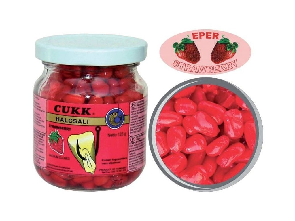 Cukk Kukurica Jahoda 125g - Osvedčená rybárska zaváraná kukurica bez nálevu od maďarského výrobcu firmy Cukk.