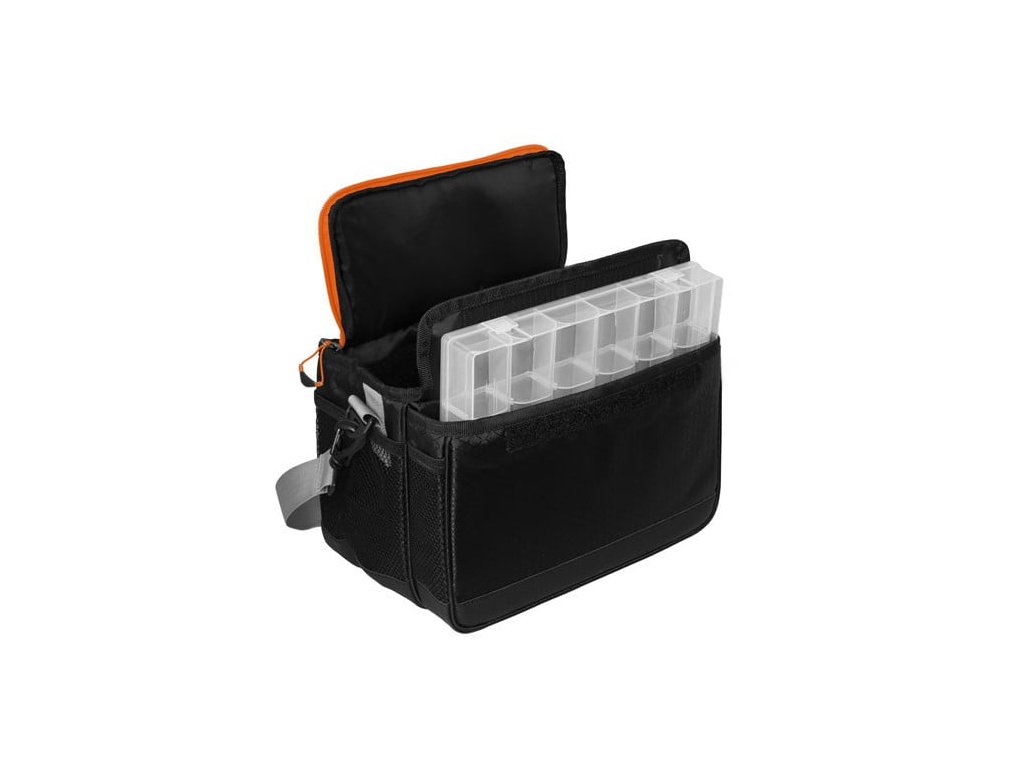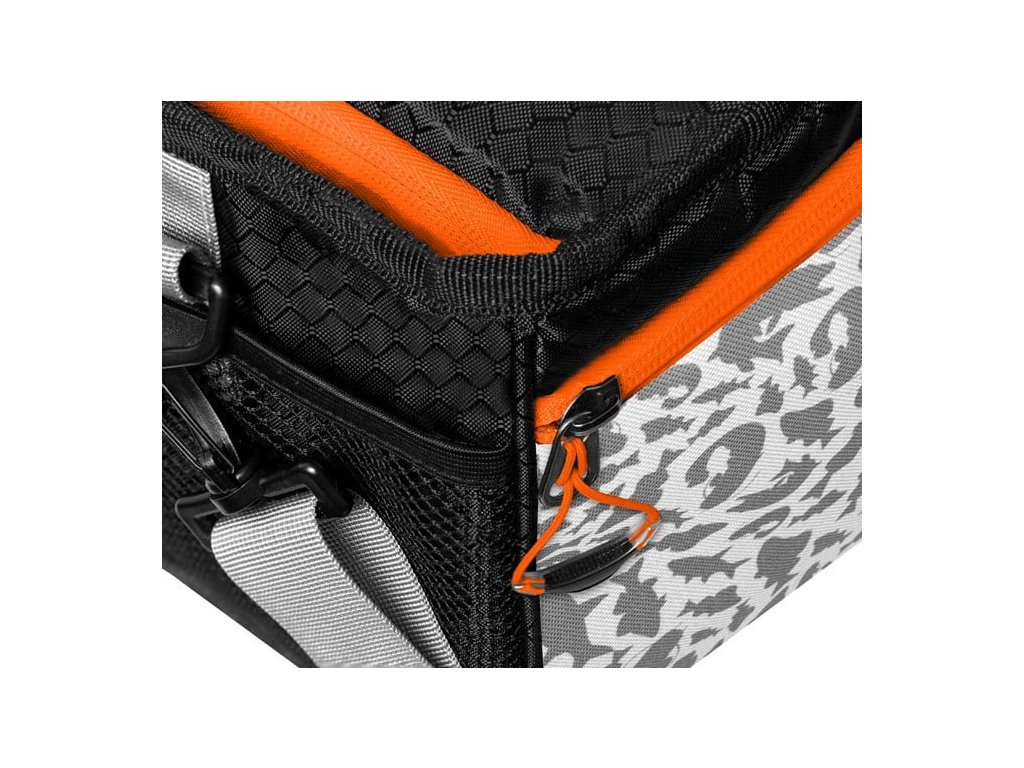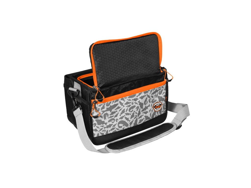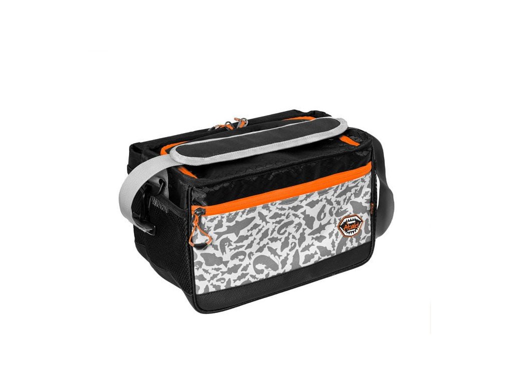 Kvalitné vonkajšie zipsy oranžovej farby sú vybavené plastovým ťaháčikom na oranžovom popruhu, ktorý je na konci rozšírený, a preto je možné ho rýchlo uchopiť. Doplnky oranžovej farby umožňujú rybárovi, aby bola taška dobre viditeľná aj za šera a vedel ju okamžite nájsť. Taška je ušitá z ľahkej, ale pritom odolnej látky čiernej farby. Vybavená je sivým popruhom určeným pre nosenie cez rameno. Dizajn tašky dopĺňa naša jedinečná sivá ATAK! kamufláž so siluetami dravých rýb.