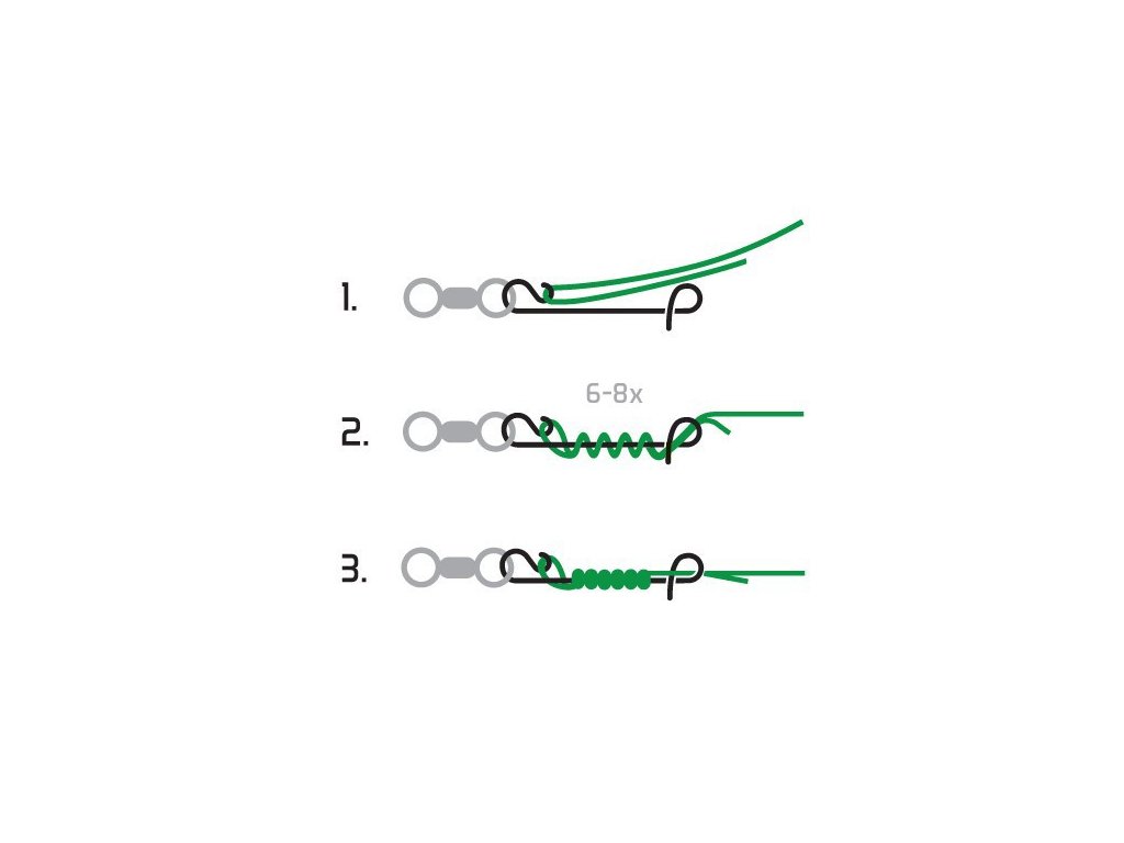 Vďaka unikátnemu tvaru cez časť pripomínajúcu háčik navlečiete požadovaný prvok, následne zaháknete slučku na vlasci, 5x obtočíte okolo tela spojky a prevlečiete koncom, kam vlasec tesne zapadne. Následne dotiahnete. Tak vytvoríte výnimočne pevné spojenie bez uzla, ktorý by znižoval nosnosť vlasca či šnúry.