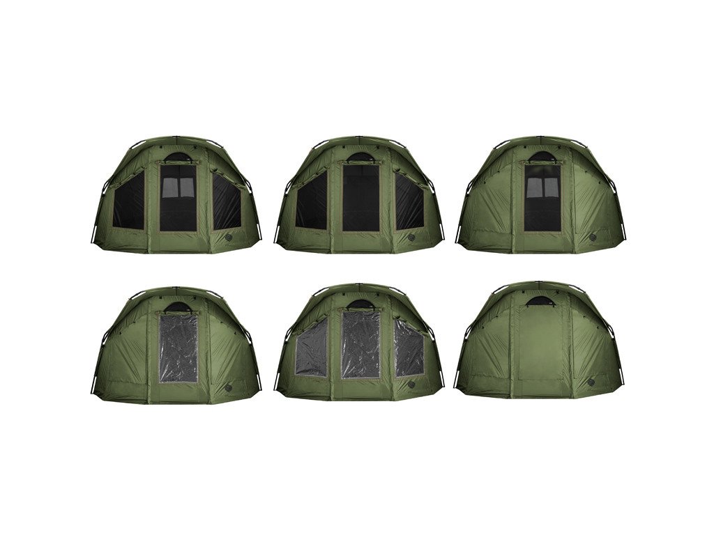 V prednej časti sa okrem dverí nachádzajú aj dve okná. Obe sú moskytiérové s možnosťou transparentných fóliových okien, alebo možnosťou plnej textílie. Fóliové okná sú súčasťou balenia a tak nemusíte dokupovať nič navyše! Pri modeli YURTA NEO sme však mysleli aj na lepšie odvetranie bivaku a aplikovali sme naň náš sofistikovaný systém CLIMA CONTROL. Tento systém je tvorený dvomi vetrákmi na protiľahlých stranách (nad vstupnými dverami a nad zadným oknom). Vďaka tomuto dômyselnému systému je možné zabezpečiť cirkuláciu vzduchu vo vnútornom priestore bivaku v čase, keď nie je možné vetrať pomocou veľkých okien. Určite ho oceníte najmä v noci, kedy výrazne napomáha znižovať kondenzáciu na vnútorných stenách. Celý systém je navyše jednoducho ovládateľný zvnútra bivaku.
