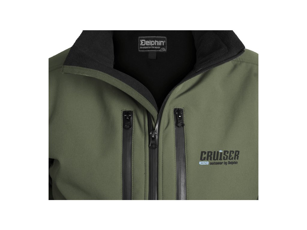 Stojatý golier obsahuje krycí lem zipsu na úrovní brady. Hlavný zips a zipsy vreciek na hrudi sú vodeodlné. Bočne vrecká neobsahujú zipsy. Rukávy a spodná časť bundy sú vybavené elastickým patentom. Vnútorná časť bundy je vyhotovená z príjemného fleecového materiálu čiernej farby. Vonkajšia časť je tvorená zeleno-čiernou farebnou kombináciou. Vďaka použitej vetruodolnej membráne je bunda vodeodolná, avšak nie nepremokavá! Bunda Delphin CRUISER Wind je pohodlná, veľmi dobre sa nosí, skvelo vyzerá a je mierne elastická. Vonkajší Softshell poskytuje veľmi dobrú tepelnú izoláciu. Bunda je vhodná pre celodenné aktivity pri chladnejšom, suchom a relatívne stabilnom počasí. Ak chcete predĺžiť jej vlastnosti, po každom praní ošetrite bundu impregnačným prípravkom určeným na Softshell. Pri praní odporúčame použiť špeciálny prací prostriedok na funkčné oblečenie, prať pri max. 40oC, nežmýkať a v prípade potreby použiť impregnačný prípravok, ktorý obnoví vodoodpudivú úpravu (DWR) vonkajšieho materiálu.Materiálové zloženie: 94% Polyester, 6% Spandex.