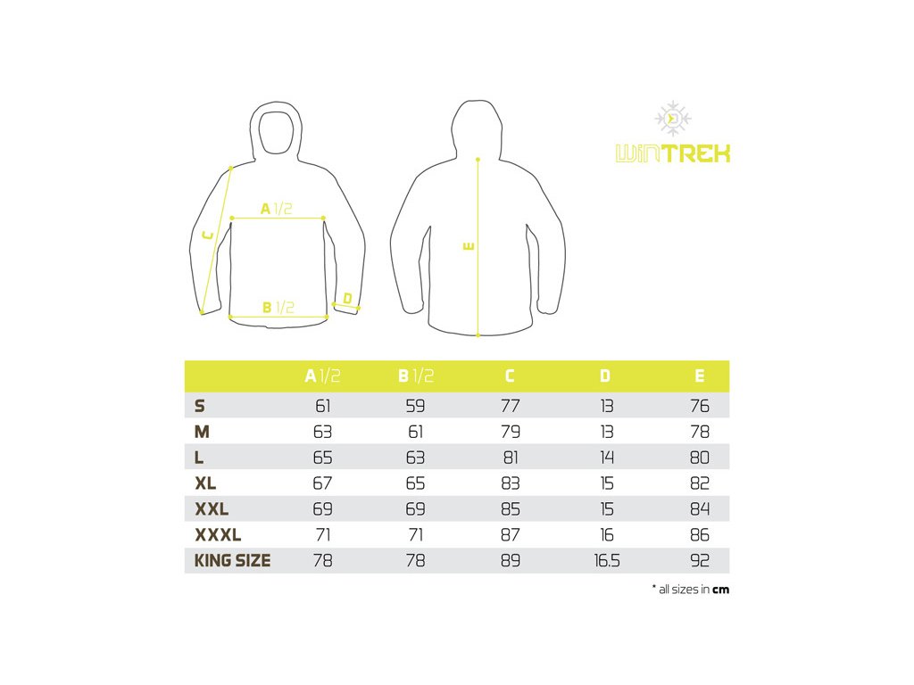 WinTREK disponuje vreckami na zips po obidvoch stranách, pričom zipsy sú prešité výraznou žltou textíliou a prekryté lemom z vodoodolnej tkaniny. Na páse sa nachádzajú dva žlté gumené popruhy určené na utiahnutie v spodnej časti. Vnútorná strana je tvorená hladkou prešívanou látkou, vďaka ktorej sa bunda ľahko oblieka a komfortne sa nosí.