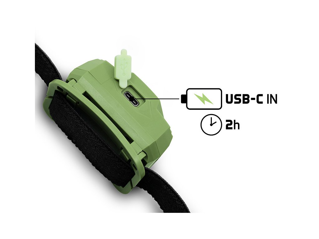Vo vnútri čelovej lampy sa nachádza Li-ion batéria s kapacitou 1000 mAh, ktorá sa nabíja pomocou USB-C vstupu. Aktuálny stav batérie si môžete jednoducho skontrolovať vďaka LED indikátoru, ktorý sa nachádza na boku tela. Plné nabitie trvá iba 2 hodiny.