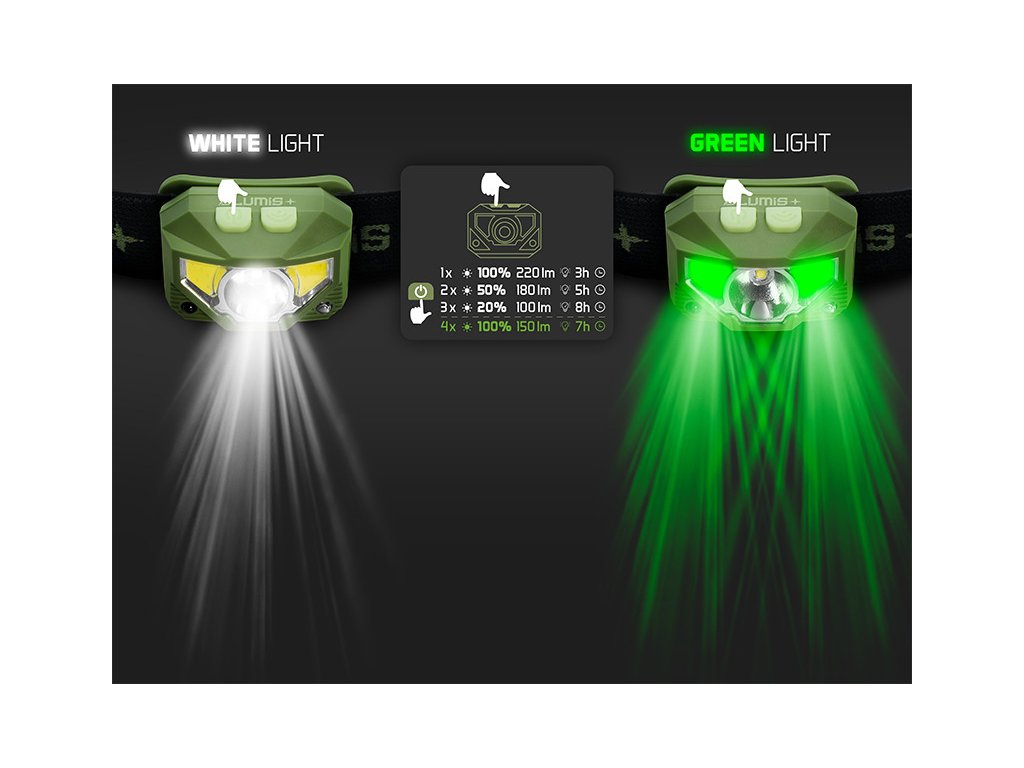 Čelová lampa je vybavená dvoma LED diódami, ktoré umožňujú prepínanie medzi klasickým bielym a zeleným svetlom. Režimy je možné meniť pomocou stláčania spínacieho tlačidla. Biele svetlo si tak môže nastaviť na tri rôzne intenzity svietivosti - 100 % (220 lm) s výdržou batérie 3 hodiny, 50 % (180 lm) vydrží svietiť 5 hodín a 20 % (100 lm), s výdržou až 8 hodín. Štvrtým stlačením sa spustí režim so zeleným svetlom s intenzitou 100 % (150 lm), ktoré poskytne svetlo po dobu 7 hodín.
