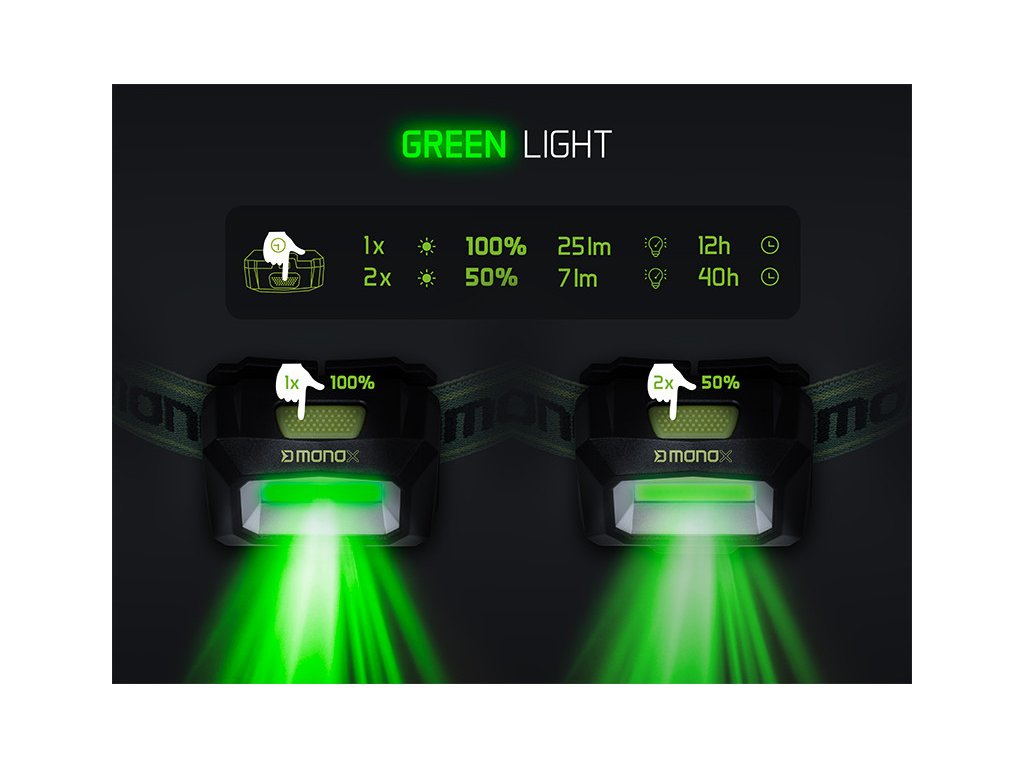 Biele svetlo ponúka tri režimy svietenia. Pri prvom kliknutí spínacieho tlačidla sa čelovka rozsvieti na 20 % svojej intenzity a v tomto režime vydrží svietiť až 17 hodín. Opätovné stlačenie spustí druhý režim s intenzitou 50 % a svietivosťou 60 lm, pričom výdrž batérie je 9 hodín. Tretím kliknutím sa aktivuje najsilnejší režim so 100 % intenzitou a výdržou 5 hodín. Dlhším podržaním tlačidla sa aktivuje zelené svetlo, ktoré má dva režimy. V prvom svieti na 100 % s výdržou 12 hodín, pričom pri ďalšom kliknutí sa intenzita zníži na 50 %, čím sa predĺži výdrž batérie až na neuveriteľných 40 hodín. Výhodou zeleného svetla je, že nepriťahuje otravný hmyz, čo oceníte najmä počas horúcich letných večerov.