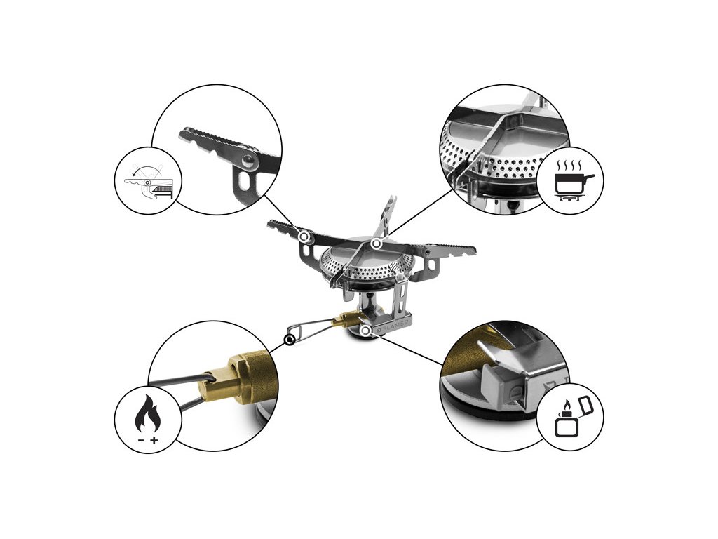 Varič je kompatibilný s propán-butánovými kartušami, ktoré sú vybavené samotesniacim ventilom so závitom 7/16. Pre maximálne jednoduchú manipuláciu je FLAMER opatrený praktickou reguláciou prietoku plynu a piezoelektrickým zapaľovaním. Vďaka tomu viac nebudete potrebovať žiadne zápalky či zapaľovač.