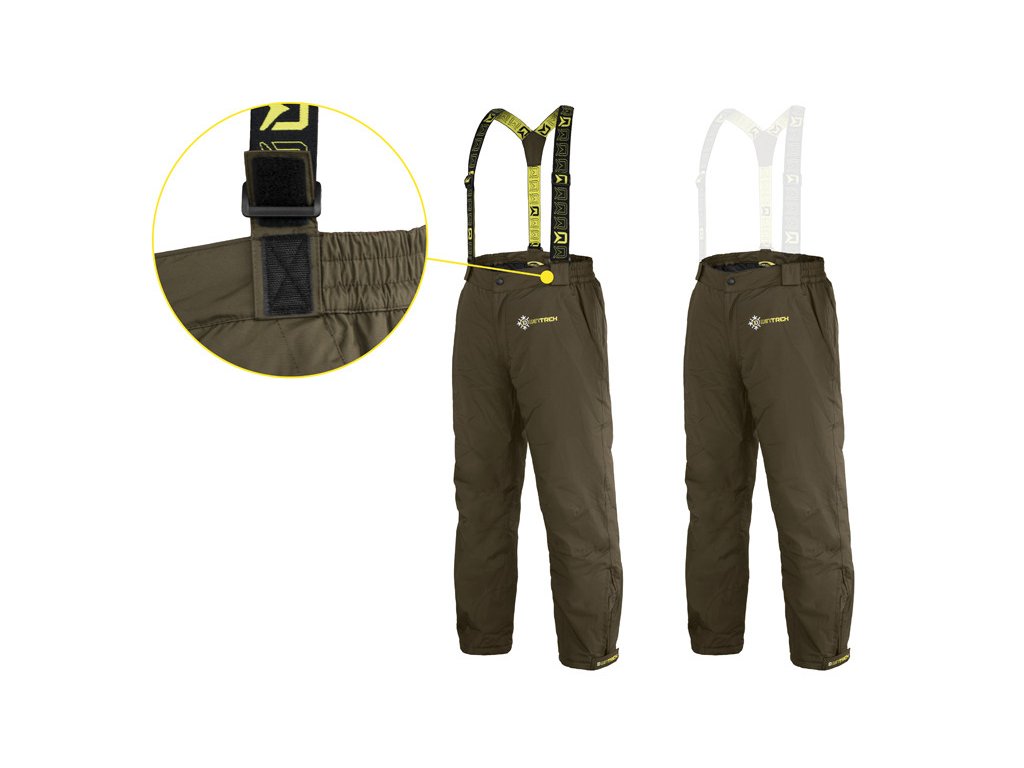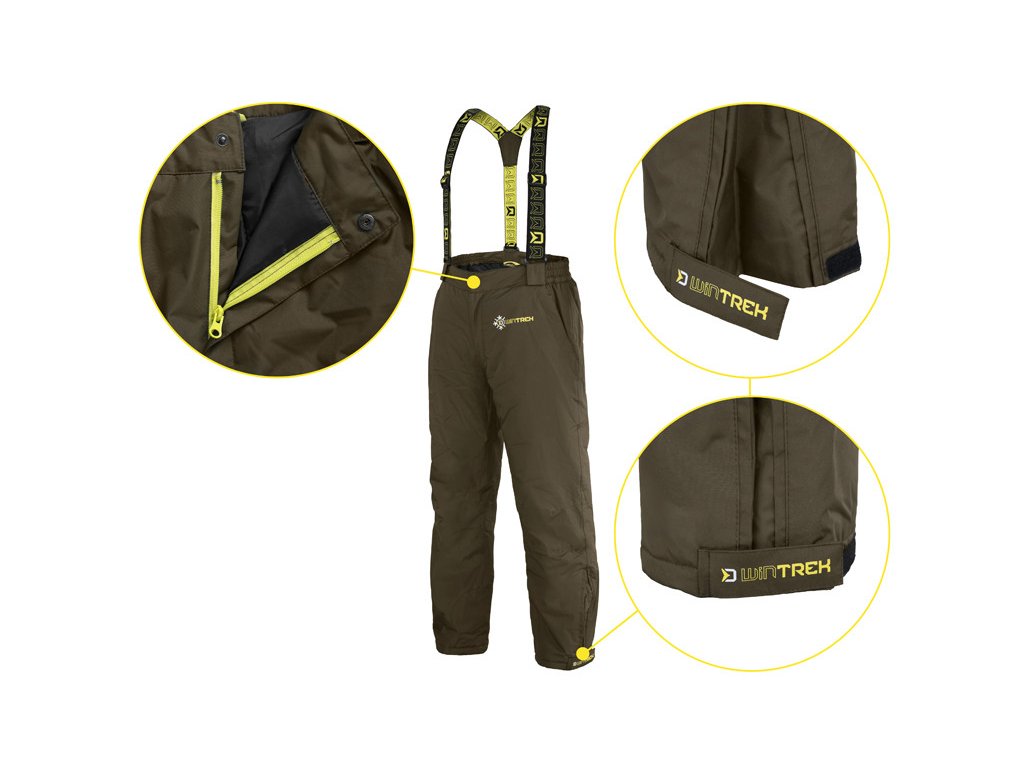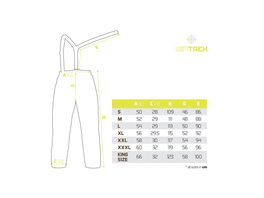 Nohavice WinTREK disponujú vreckami na zips po obidvoch bokoch, pričom zipsy sú prešité výraznou žltou textíliou a prekryté lemom z vodoodolnej tkaniny. Na páse sa nachádzajú gumené traky nastaviteľné podľa Vašej výšky a kompletne odopínateľné na suché zipsy. Samotný pás disponuje všitou gumičkou zvyšujúcou jeho flexibilitu a pružnosť. Vnútorná strana je tvorená hladkou prešívanou látkou, vďaka ktorej sa nohavice ľahko obliekajú a dobre nosia.