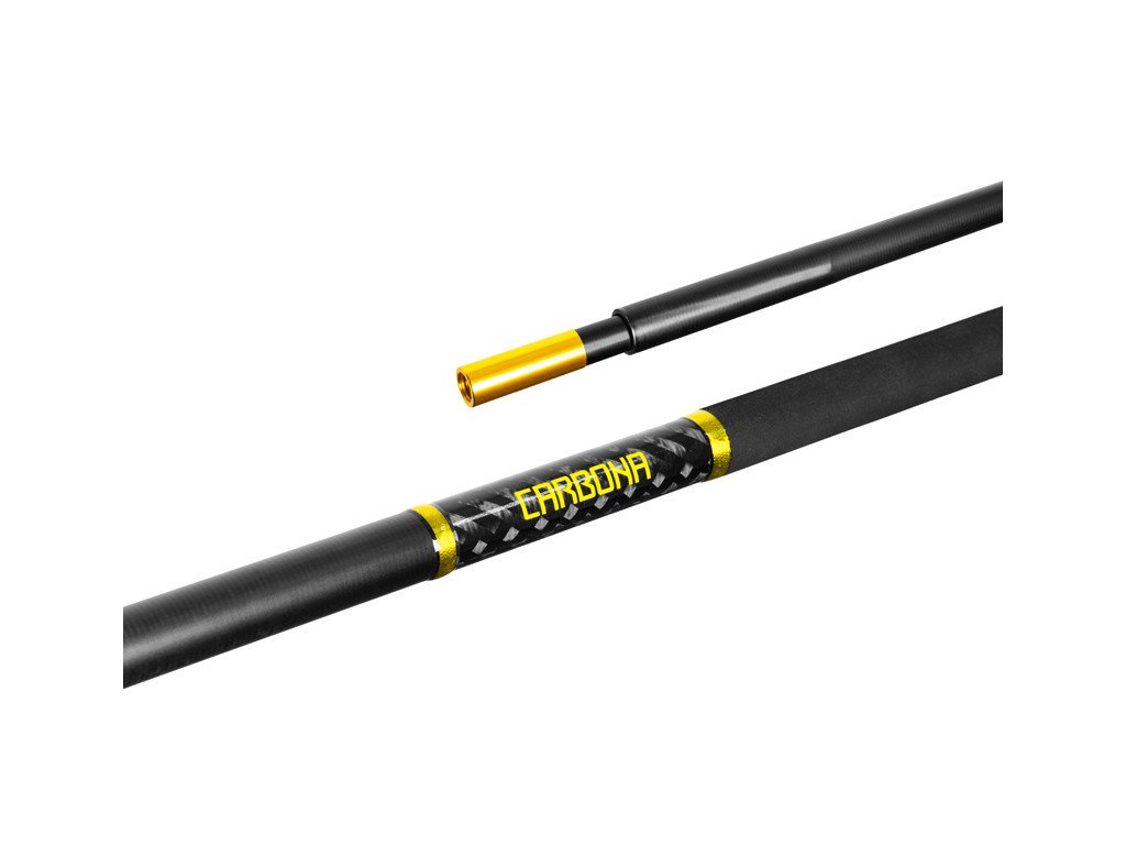 Delphin Rukoväť CARBONA Tele 1,80m - Séria luxusných, ľahkých a dizajnovo pekných podberákových tyčí CARBONA vyhotovená z pevného uhlíkového materiálu. Tieto modely sú určené na použitie s kaprovými hlavami, poradia si aj s prívlačovými, či feedrovými hlavami, pokiaľ nepotrebujete veľmi dlhú rukoväť. Skvelo sa uplatnia aj pri love na lodi, kde nie je potrebná extra dlhá rukoväť. Vďaka tomu, že sa jedná o dvojdielne tyče, nájdu si svoje miesto vo výbave milovníka ľahkého a úsporného rybolovu. Teleskopická verzia má dlhšiu NEO-FOAM rukoväť s kovovým závitovým ukončením. Zlaté prvky na samotnom tele podberákovej tyče zvýrazňujú jej decentný a luxusný charakter.