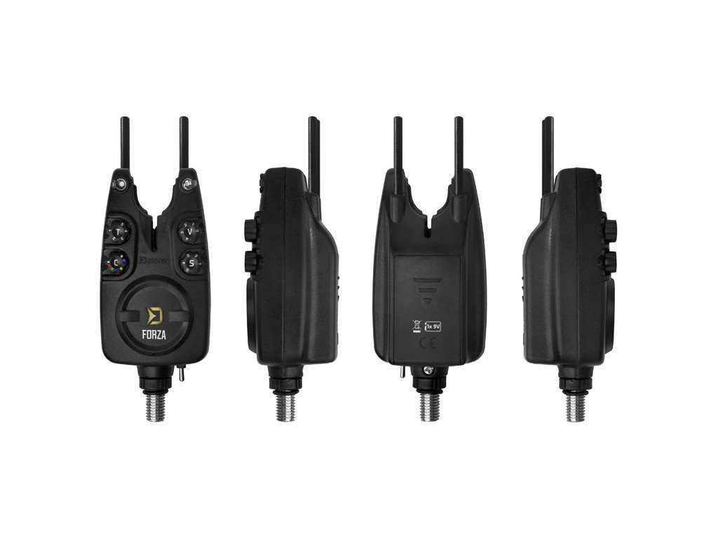 Signalizátory disponujú širokou škálou voliteľných parametrov. Tón signalizácie (spínač T) a citlivosť v rozmedzí 1-9cm (spínač S) je možné navoliť podľa potreby až z piatich možností. Pri “padáku“ resp. spätnom zábere budete upozornený odlišným tónom. Hlasitosť je možné nastaviť taktiež v piatich rôznych úrovniach, pričom úroveň 0 predstavuje tichý mód. Nespornou devízou signalizátorov zo sady FORZA je možnosť vybrať si spomedzi 7 farieb signalizačnej LED diódy. Každý si tak vyberie svoju obľúbenú a pokiaľ zatúžite po zmene, tak si jednoducho zvolíte inú farbu pomocou otočného spínača “C (colour)“ a nemusíte tak kupovať nový signalizátor. V spodnej časti sa nachádza vstup pre 2,5 mm konektor pre pripojenie svietiaceho indikátora záberu. Každý signalizátor navyše disponuje závitmi na upevnenie snag gearov, ktoré sú aj súčasťou balenia. Navyše k signalizátorom získavate pevný transportný kryt a k prijímaču stolový držiak!