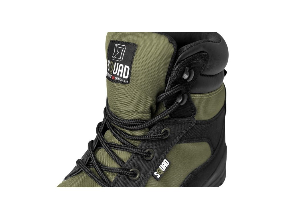 Na povrchu je použitá veľmi pevná tkanina, ktorá dobre odoláva vode, ale aj ostrým predmetom. Gumená podrážka sa nešmýka, hrubý dezén napomáha pri prekonávaní terénnych prekážok. Topánky sa šnurujú cez 4 očká a 2 háčiky. Jazyk je prešitý až do časti s háčikmi, do tejto výšky sa môžete krátkodobo pohodlne pohybovať v mokrom a vlhkom prostredí. Medzi vonkajšou a vnútornou mikrofleecovou vrstvou sa nachádza izolačná vrstva 3M Thinsulate, ktorá je vyrobená zo syntetických vlákien s veľmi vysokou hustotou. Nepremokavosť, dobrá tepelná izolácia a pohodlie nosenia. To sú 3 hlavné atribúty topánok Delphin SQUAD. Okrem rybárov sú veľmi vhodné aj pre poľovníkov, turistov a všetkých milovníkov prírody.