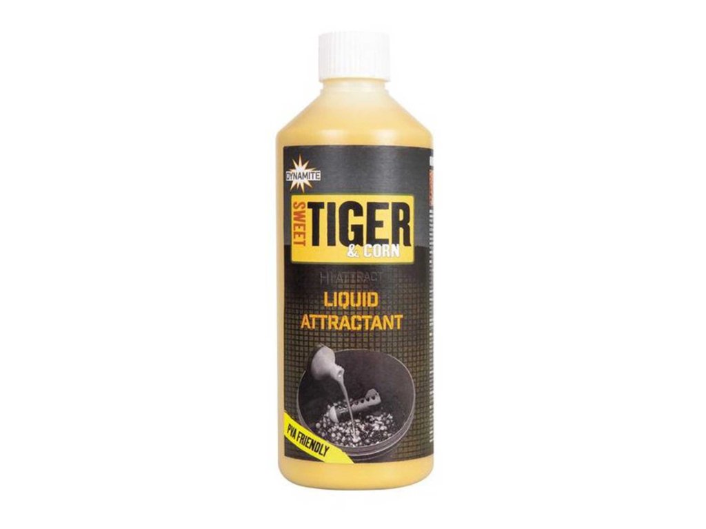 Dynamite Baits Liquid Attractant Sweet Tiger Corn 500 ml - Táto špeciálna zálievka z produkcie Dynamite baits je zložená z vysoko atraktívnych aróm, ktoré majú vysokú vábivú schopnosť a zvyšujú apetit rýcb v každom ročnom období.Touto zálievkou viete jednoducho a hlavne účinne zatraktívniť vaše krmivo, boilies, pelety a akékoľvek iné návnady.Ideálne je po zaliatí nechať odstáť pár minúť, tiež pelety alebo boilies aj niekoľko hodín aby sa zálievka dostala viacej do vnútra návnady. Tým pádom sa dlhšie bude uvoľnovať vo vode.