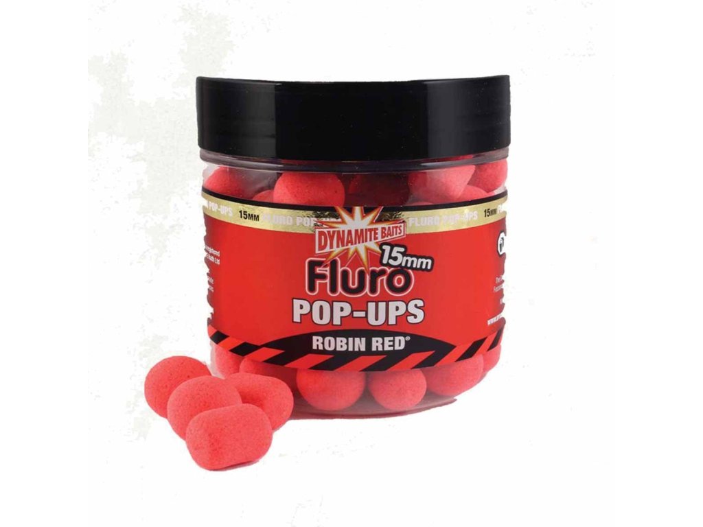 Dynamite Baits Pop-Ups Fluro Robin Red 15mm - Plávajúce vysoko vzplývavé boilies od Dynamite baits v silnej červenej farbe s príchuťou Robin Red.