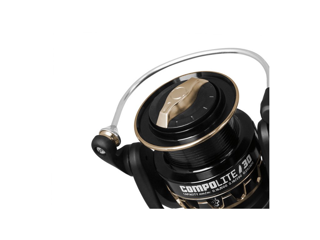 Má prevod 5.1:1 a o bezchybný chod sa postará spolu 7 ložísk. Telo je vyhotovené z kompozitného uhlíkového materiálu, vďaka ktorému je veľmi ľahké, pri zachovaní maximálnej odolnosti. Vnútorný mechanizmus je postavený na overenom základe, a tak je navijak veľmi spoľahlivý a ponúka solídny výkon. Dodáva sa s ľahkou hliníkovou cievkou, nie je však problém dokúpiť ďalšie cievky, samozrejme taktiež kovové. Kovovú rukoväť s pohodlným EVA madlom je možne použiť na pravú i ľavú ruku. Na preklápač sme použili hrubý drôt, vďaka ktorému sa nemusíte obávať o jeho životnosť. Samotné preklápanie je veľmi tiché a hladké. V štandarde nájdeme kombináciu kovových a karbónových brzdných podložiek, vďaka ktorým je brzdenie rýchle a veľmi efektívne. Dizajnovo je COMPOLITE nádherný navijak v matnom čiernom vyhotovení s matnými medenými prvkami. Stane sa tak ozdobou každého prúta a výbavy moderného rybára.
