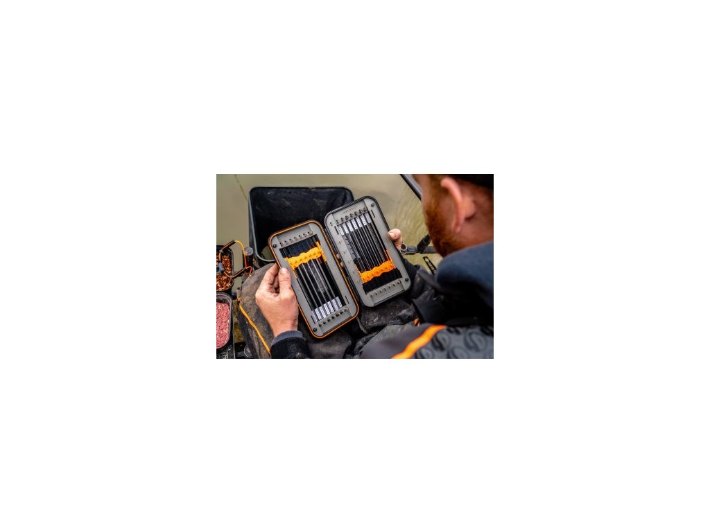 Samotné vsuvky sú vhodné pre všetky druhy háčikov, dokonca až po háčiky s jemným drôtom o veľkosti 24. Sú super odolné a zároveň sa ľahko používajú s malým prekrývacím ostňom na ich vrchu, aby sa zabránilo skĺznutiu háčikov. Súčasťou puzdra je sada meracích vsuviek, ktoré sú zdvihnuté, čo umožňuje rybárom rýchlo a ľahko zmerať dĺžky montáží pri ich viazaní, než ich vloží dovnútra. Samotné špendlíky sú tiež dlhé, takže na ne môžete mať množstvo montáží, pričom puzdrá majú kapacitu pre viac ako 600 hotových náväzcov!