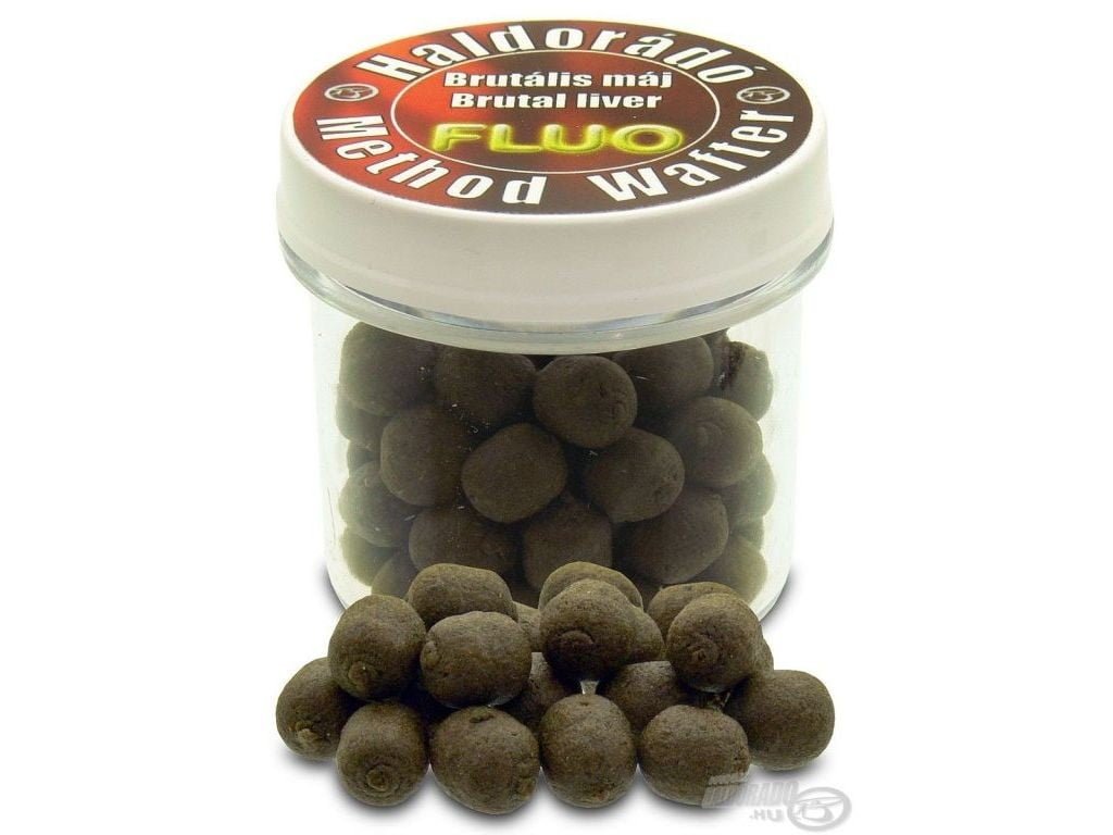 Haldorádó Fluo Method Wafters 8mm Brutal Liver 10g - Nové pelety wafters, ktoré sú iba nadľahčené a nie sú plávajúce. Ak hodíte samotnú peletu do vody tak sa vznáša, ale ak je nastražená na návnadový osteň tak leží na dne.