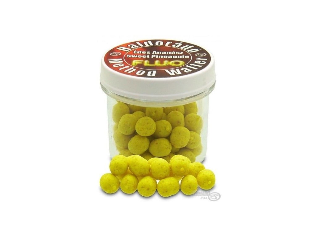 Haldorádó Fluo Method Wafters 8mm Sladký Ananás 10g - Nové pelety wafters, ktoré sú iba nadľahčené a nie sú plávajúce. Ak hodíte samotnú peletu do vody tak sa vznáša, ale ak je nastražená na návnadový osteň tak leží na dne.