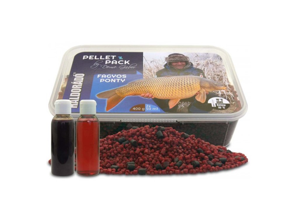Haldorado Pellet Pack Pro By Dome Gábor - Mrazivý Kapor - Vynovený Pellet Pack sa už nepredáva v papierovej krabičke, ale v uzatvárateľnej plastovej krabičke. V tomto dokážeme namiešané krmivo udržať dlhšie čerstvé a môžeme ho použiť aj po vyprázdnení.Každá verzia obsahuje 400 gramov zmesi 2, 3 a 4 mm peliet. Menšie pelety sú zložené z tých najcennejších ingrediencií v našich najchytľavejších a roky dobre fungujúcich krmivách. Farebné, chutné maškrty, ktoré zmäknú rýchlo/stredne rýchlo vo vode ale nerozpadnú sa. 4 mm verzia je príchuť halibut pelet, ktorá mäkne veľmi pomaly a zanecháva tvrdú, chrumkavú časticu, ktorá pôsobí vo vode po dlhú dobu. Vďaka vysokému obsahu oleja v halibutovi smeruje nasmeruje aj ryby pohybujúce pri hladinách vody na dno koryta.
