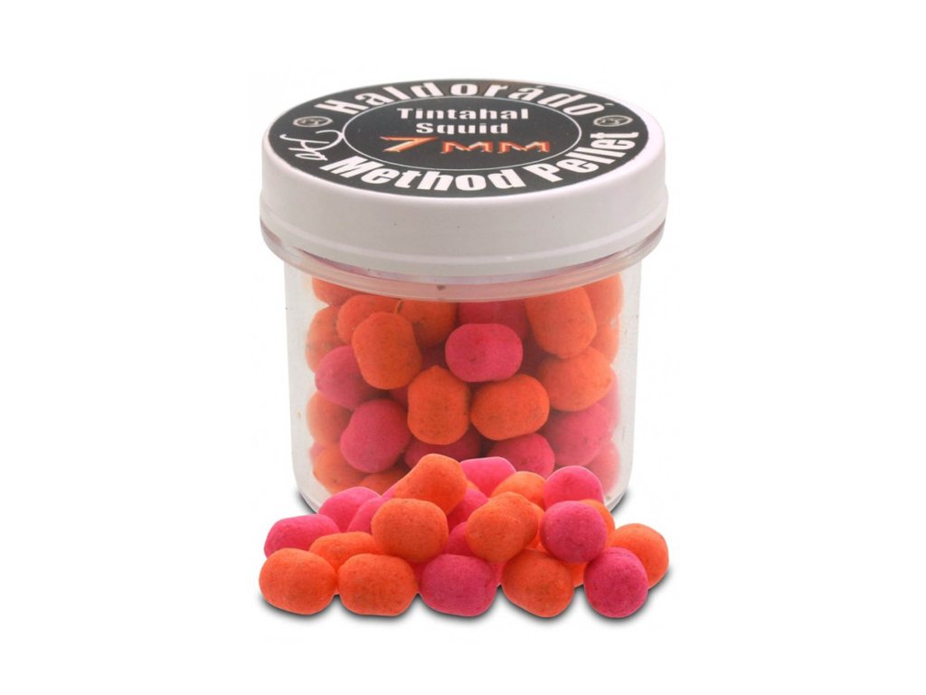 Haldorado Pro method pellet 7mm Squid 10g - Ak lovíte feeder method technikou tak práve Vám sa bude najviac páčiť naša nová nástraha s označením Haldorádó Pro Method Pellet. Tieto malé nástrahy sa vyrábajú v rôznych príchutiach.Ako ste si už mohli zvyknúť na to, že naše method nástrahy sú obvykle vznášajúce sa tak aj tieto nové nástrahy sa vznášajú vo vode. Jedna 7mm peletka nastaržená na 10milimertový nástrahový osteň Fine a naviazaný na háčik GURU QM1 veľksoti č 10 bude kriticky vyvážaná zbraň na ryby. Tieto malé nástrahy sme zabalili do malých plastových dôzičiek ktoré majú plastovú zátku aj vrchná kvôli čomu nástrahy nestrácajú arómu a nevysychajú.