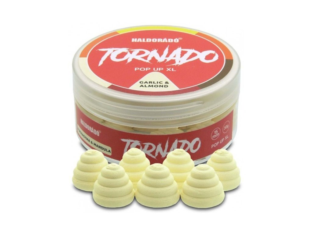 Haldorádo Tornado Pop Up XL Cesnak Mandla 15mm 30g - je pozoruhodne tvarovaná, mimoriadne atraktívna, varená, plávajúca nástraha, ktorá si dokáže zachovať vo vode tvar aj nadnášacie vlastnosti po celé dni, zatiaľ čo zo seba neprestajne chrlí vábivú príchuť a arómu. Príchuť a arómu však uvoľňuje pomaly a rovnomerne, v žiadnom prípade vo vode „nedymí“.Dalo by sa povedať, že spomedzi všetkých nástrah sme sa tejto venovali asi najdôkladnejšie. Preskúšali sme ju na veľkom počte testovacích plôch, či už šlo o malé jazierka, veľké nádrže, alebo obrovské prirodzené plochy. Všade sa ukazovala byť neuverteľne chytľavá!