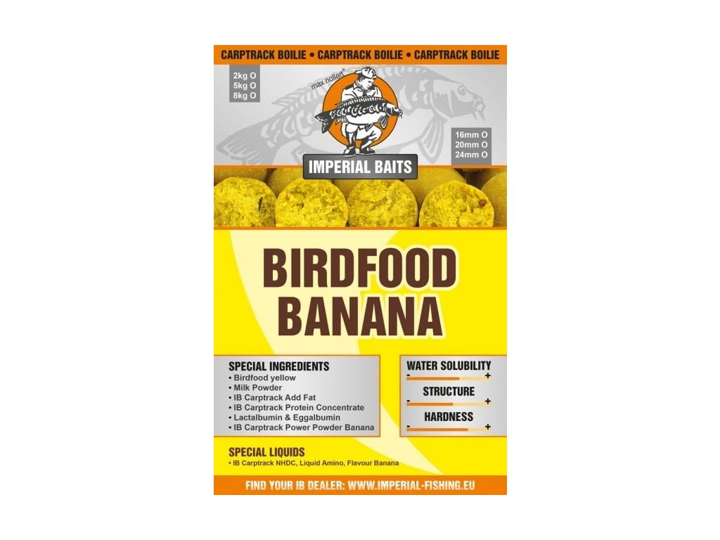 Imperial Baits Boilies Birdfood Banana 24mm 2kg - Toto boilies je zložené zo 100% Carptrack Birdfood banánového mixu s obsahom rozpustného sušeného mlieka pre jahňatá, Carptrack NHDC (6ml / kg), Liquid Amina (12ml / kg) a pravdepodobne najlepšie banánovej esencie na trhu (8ml / kg). Vďaka týmto zložkám je chuť a vôňa tohto boilie veľmi charakteristická a intenzívna.