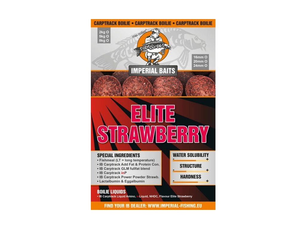 Imperial Baits Boilies Elite Strawberry 24mm 2kg - O boilies ELITE STRAWBERRY môžeme s istotou povedať, že sa jedná o jednu z celosvetovo najobľúbenejších nástrah na kapry. Bolo na nej Nachytané neskutočné množstvo veľkých kaprov a vďaka vám ich môže byť ešte viac!Základ boilies Carptrack ELITE STRAWBERRY boilies tvorí rybej múčky. Ďalej sú v ňom obsiahnuté vo vode rozpustné zložky INP, GLMextrakt, Carptrack Protein koncentrát a koncentrovaný chuťový stimulátor Strawberry POWER POWDER. Z tekutých zložiek obsahuje originálne sladidlo Carptrack NHDC (5ml / kg), Carptrack Liquid Amino (18ml / kg), Carptrack INL (18ml / kg) a Carptrack esenciu Elite Strawberry – poklad vo svojej najčistejšej forme.