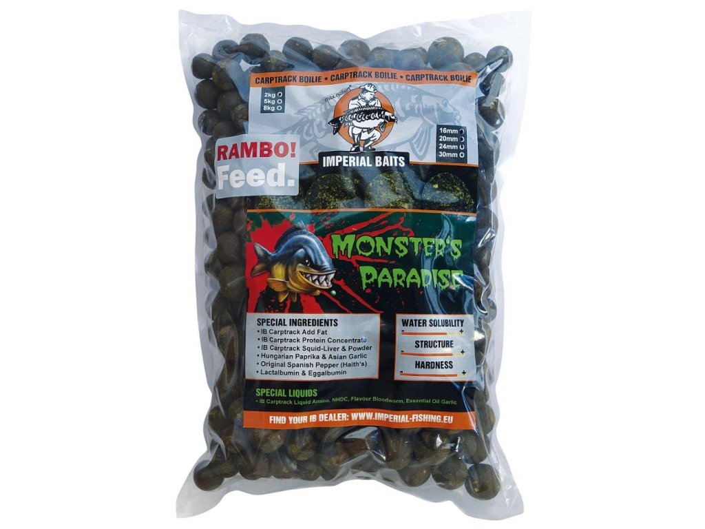 Imperial Baits Boilies Rambo Feed Monsters Paradise 2kg mix - nové, kvalitné ale zato ekonomické prevedenie kŕmnych boilies od značky Imperial Baits. Tento mix obsahuje 3 priemery tvrdených RAMBO FEED guličiek, v identickej aróme. Tento mix, je ideálna na výpravy alebo kŕmne kampane, kedy je cielom uloviť čo najväčšiu rybu.Tieto boilies sú tvrdšie ako ostatné klasické boilies a preto vydržia extra dlho!