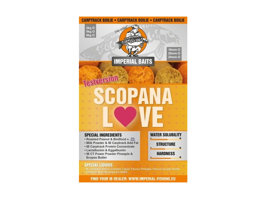 Imperial Baits Boilies Carptrack Scopana.Love 20mm 2kg - SCOPANA LOVE – sladké pokušenie, ktorému kapry nemôžu odolávať! Vyvážená kombinácia zmesí vtáčích zobov, čerstvých pražených orechov a originálnych esencií Scopex Butter a Ananás, najlepšia voľba na kaprov!