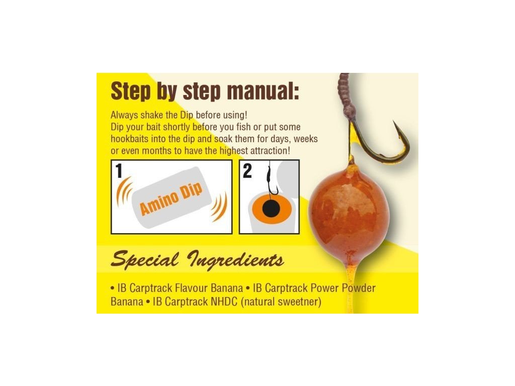 Ako dipy používať: Namočte Vašu nástrahu najmenej na 24 hod v jednom z našich Amino dipov. Týmto spôsobom zvýšite vábiacu vlastnosti vašej nástrahy – obvzlášť potom pre krátkodobý rybolov. Nástrahy môžu zostať v dipe aj niekoľko mesiacov bez zmeny ich vlastností. Kapor takto nadipovanou nástrahu nájde veľmi rýchlo!