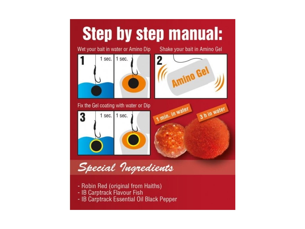 Ako dipy používať: Namočte Vašu nástrahu najmenej na 24 hod v jednom z našich Amino dipov. Týmto spôsobom zvýšite vábiacu vlastnosti vašej nástrahy – obvzlášť potom pre krátkodobý rybolov. Nástrahy môžu zostať v dipe aj niekoľko mesiacov bez zmeny ich vlastností. Kapor takto nadipovanou nástrahu nájde veľmi rýchlo!