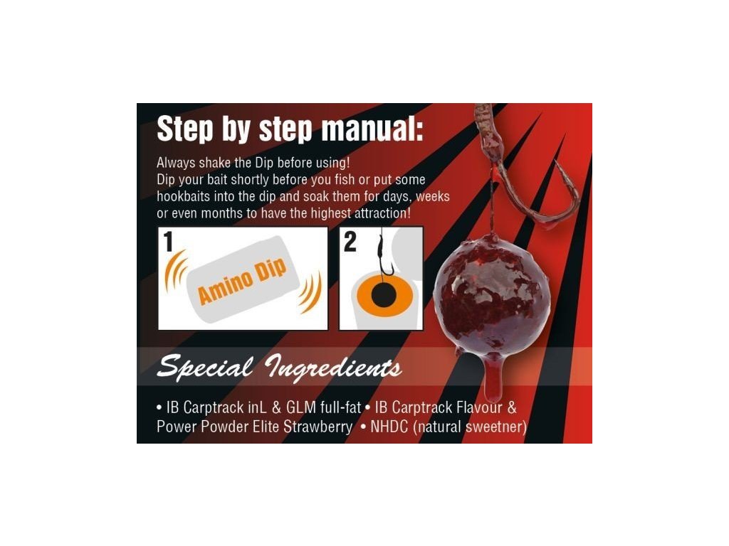 Ako dipy používať: Namočte Vašu nástrahu najmenej na 24 hod v jednom z našich Amino dipov. Týmto spôsobom zvýšite vábiacu vlastnosti vašej nástrahy – obvzlášť potom pre krátkodobý rybolov. Nástrahy môžu zostať v dipe aj niekoľko mesiacov bez zmeny ich vlastností. Kapor takto nadipovanou nástrahu nájde veľmi rýchlo!