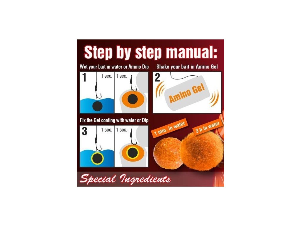 Ako dipy používať: Namočte Vašu nástrahu najmenej na 24 hod v jednom z našich Amino dipov. Týmto spôsobom zvýšite vábiacu vlastnosti vašej nástrahy – obvzlášť potom pre krátkodobý rybolov. Nástrahy môžu zostať v dipe aj niekoľko mesiacov bez zmeny ich vlastností. Kapor takto nadipovanou nástrahu nájde veľmi rýchlo!