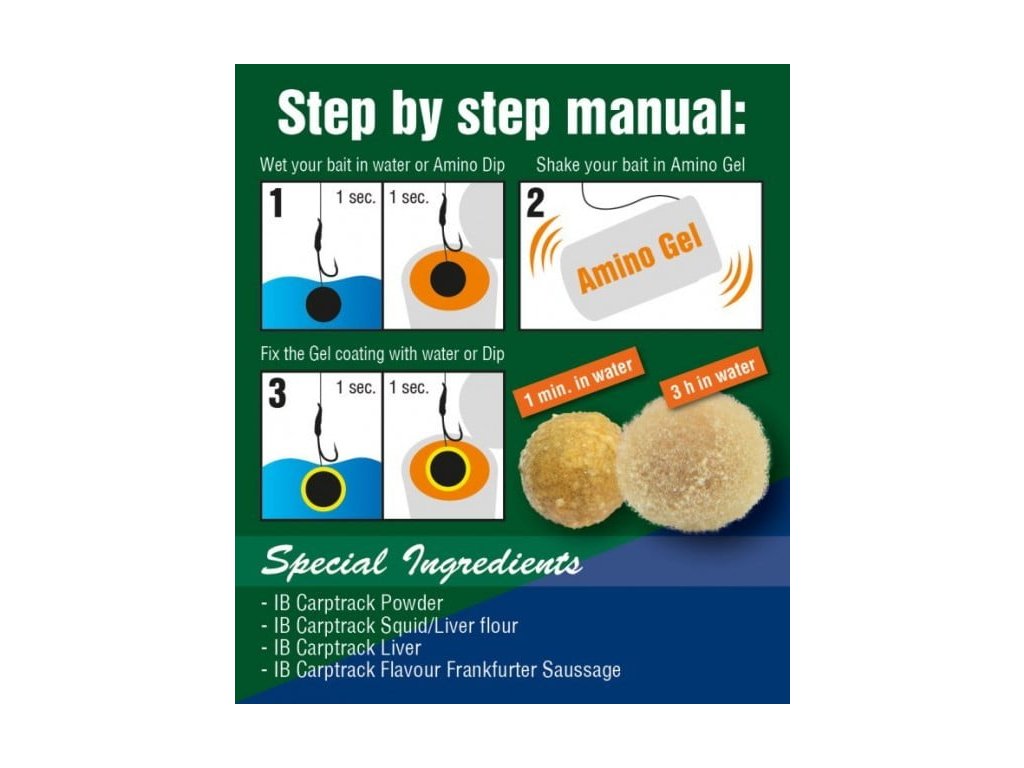 Ako gély používať: Navlečte svoju nástrahu na vlas pod háčik. Ponorte ju krátko do vody alebo ešte lepšie do Amino Dipu. Následne ju vložte do Aminogelu, zamiesiť viečko a pretrepte. Nástraha sa krásne obalí. Tento postup môžete niekoľkokrát zopakovať. Získate tak absolútne neodolateľnú atraktívny nástrahu.