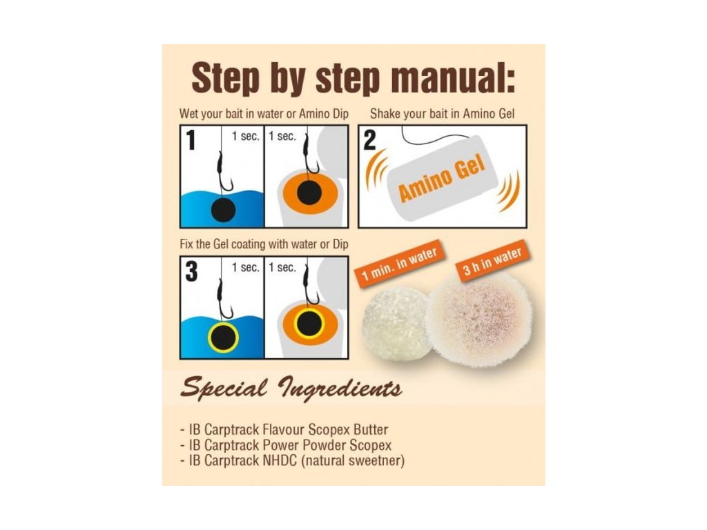 Ako gély používať: Navlečte svoju nástrahu na vlas pod háčik. Ponorte ju krátko do vody alebo ešte lepšie do Amino Dipu. Následne ju vložte do Aminogelu, zamiesiť viečko a pretrepte. Nástraha sa krásne obalí. Tento postup môžete niekoľkokrát zopakovať. Získate tak absolútne neodolateľnú atraktívnu nástrahu.