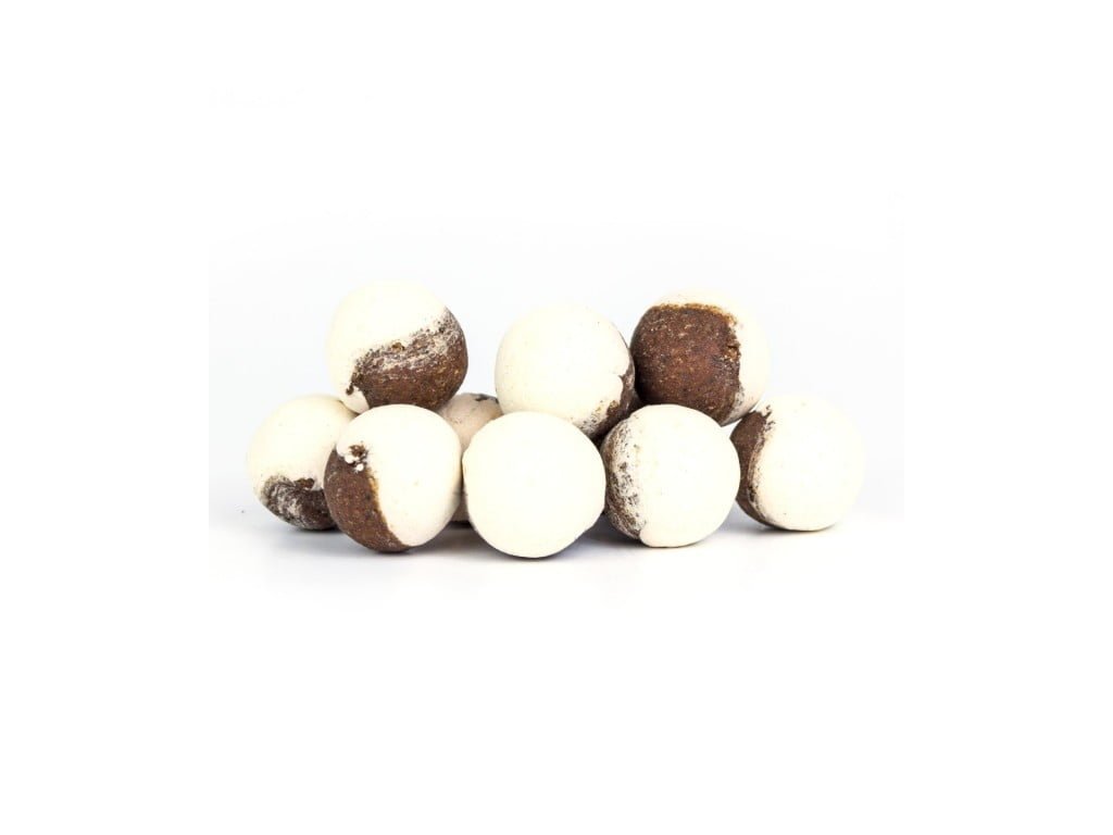 Výhody nového boilie: Nikdy nepoznáte presnú farbu dna, na ktorom budete loviť a tiež neviete či kapry budú vnímať lepšie tmavšie alebo svetlé nástrahy. V tomto prípade budete zakrmovat absolútne identickým boilie v dvoch rozdielnych farbách, takže máte vždy záruku dobrej viditeľnosti vašej návnady vo vode. Znie to jednoducho a take to je úplne prosté! Rovnaké je to s použitím nového boilies primo pod háčikom. Máte možnosť voľby v rôznych situáciách, môžete kombinovať a kapra prekvapiť. Efekt kontrastných nástrah jasne preukazujú naše Half'n'half nástrahy už od roku 2007.