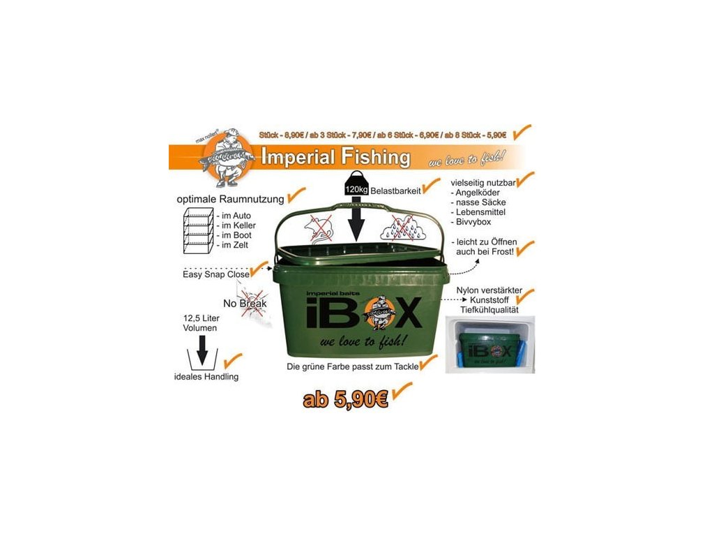Imperial Baits iBox 12,5 L- Legendárne plastové vedro iBox od firmy IMPERIAL BAITS na Vaše návnady a príslušenstvo. Vedro sa dodáva s uzamykateľným plastovým vekom.
