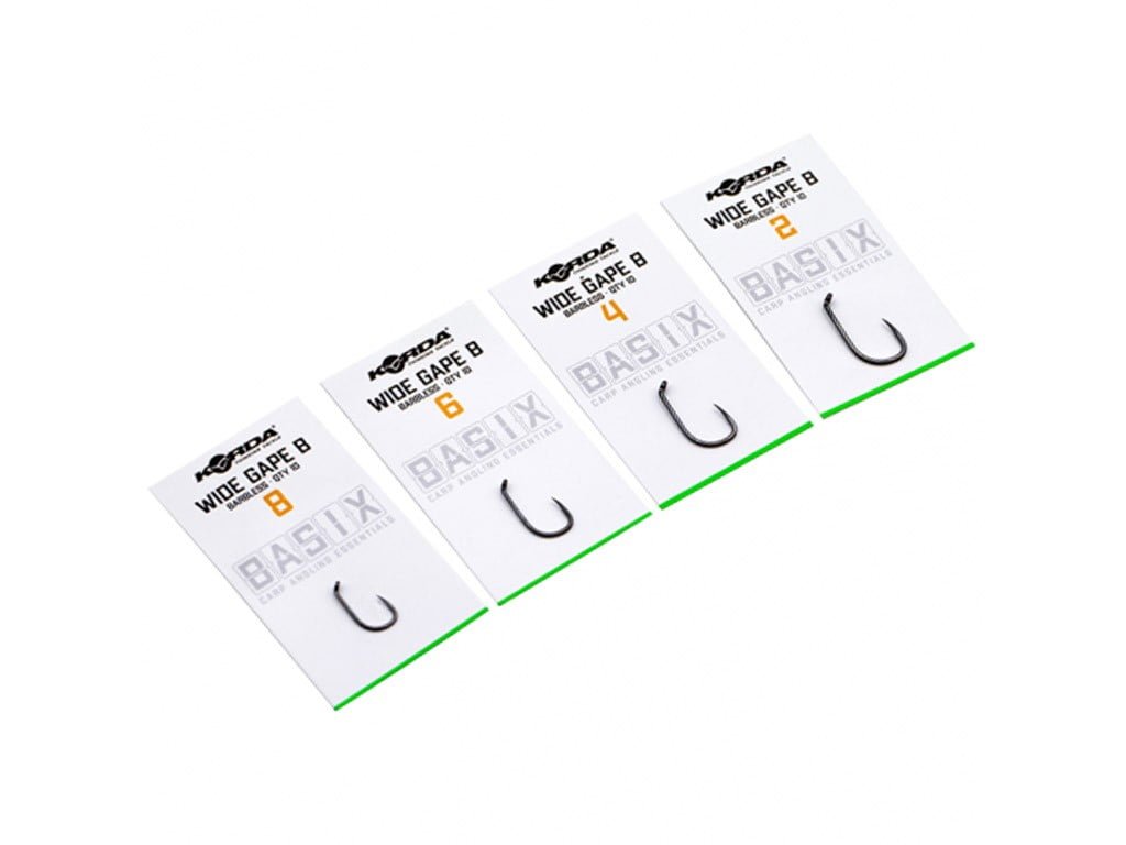 Korda Basix Wide Gape Barbless vel. 6 - Agresívny tvar háčika zaisťuje, že sa veľmi rýchlo stáča a zasekáva v kaprej papuľke, bez toho aby bolo nutné pridávať rovnátko Kickers alebo zmršťovaciu hadičku.