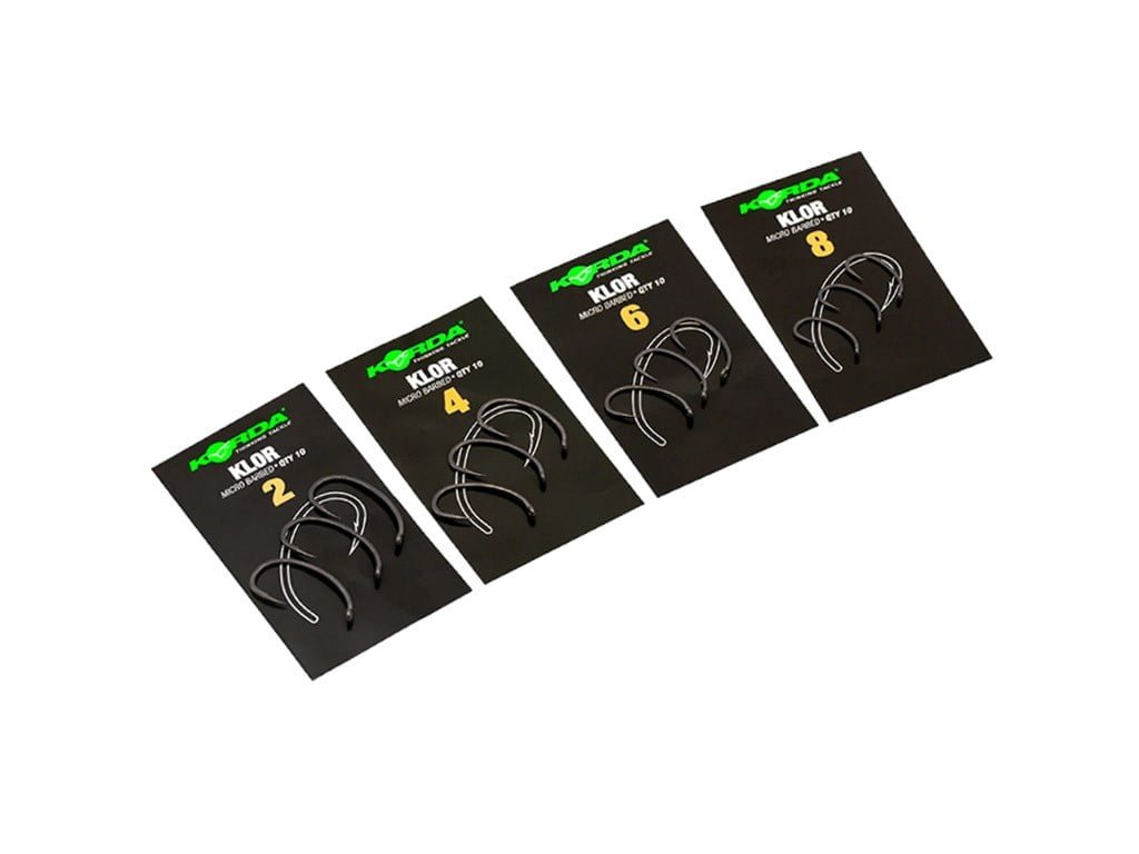 Korda Klor Barbless vel.2 - Ďalšia evolúcia háčikov ktoré vznikli spojeným dvoch typov kaprových háčikov Korda Kurve a Wide Gape čo nesie názov Klor, ktorý má agresívnejší tvar, oko je otočené do vnútra a hrot háčika tiež smeruje do vnútra. Tento typ háčikov vyvíjal sám Danny Fairbrass z Teamu Korda.