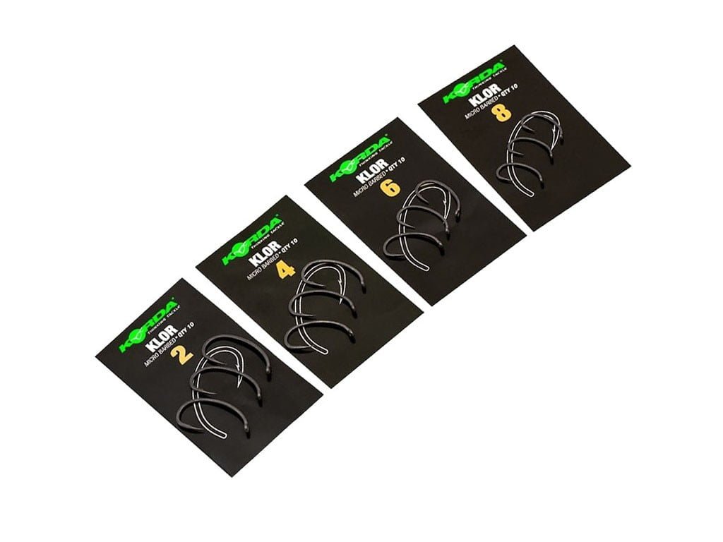 Korda Háčik Klor vel.2 - Ďalšia evolúcia háčikov ktoré vznikli spojeným dvoch typov kaprových háčikov Korda Kurve a Wide Gape čo nesie názov Klor, ktorý má agresívnejší tvar, oko je otočené do vnútra a hrot háčika tiež smeruje do vnútra. Tento typ háčikov vyvíjal sám Danny Fairbrass z Teamu Korda.