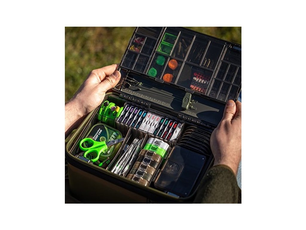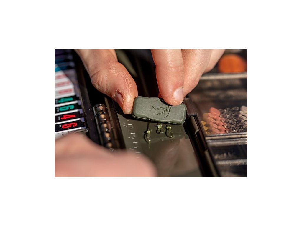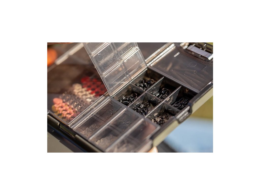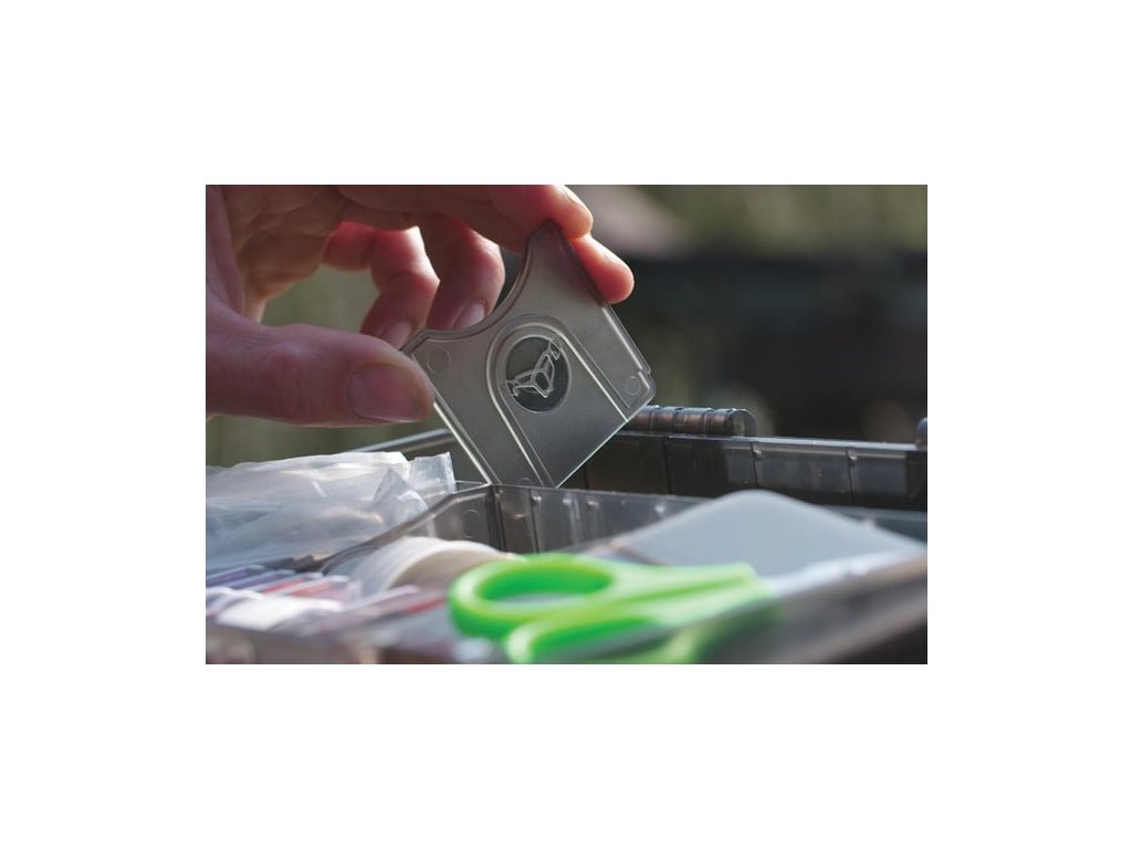 Má 29 priehradiek najrôznejších veľkostí na uloženie rôzne veľkých drobností, plus magnetickú dosku na vaše nadväzce (ideálne na uloženie 10ks nadväzcov). Priehradky sú variabilné. Nedávno aktualizované štvorcové háčikové háčiky od spoločnosti Korda dokonale zapadajú do tohto boxu, rovnako nové krabičky s háčikmi Kamakura, a tiež je ideálne na nové boxy Leader-Safe a Mini.