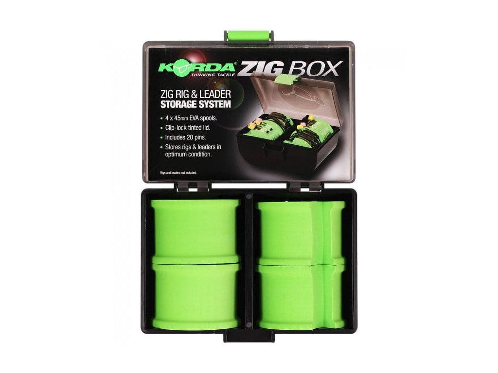 Korda Zig Box - Tento Zig Box bol navrhnutý tak, aby vám pomohol ukladať desiatky náväzcov na Zig Rig, spolu s vlascami, plavákmi alebo háčikmi. Puzdro sa dodáva so štyrmi širokými EVA cievkami, okolo ktorých si môžete namotať dlhé náväzce