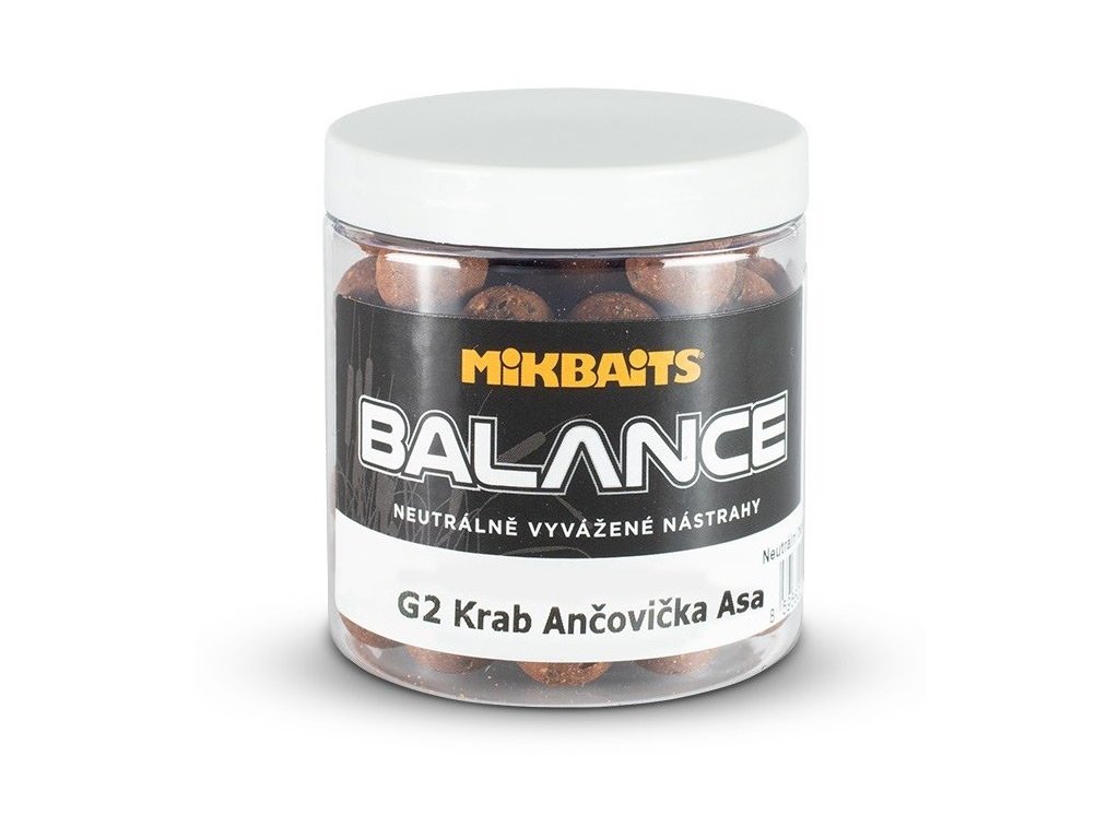 Mikbaits Boilies Balance G2 Krab Ancov. Asa 20mm 250ml - Balance sa vyrábajú z rovnakých zmesí a AK ako boilie rovnakej príchute, navyše sú ale do nich pridané extra ľahké zložky.