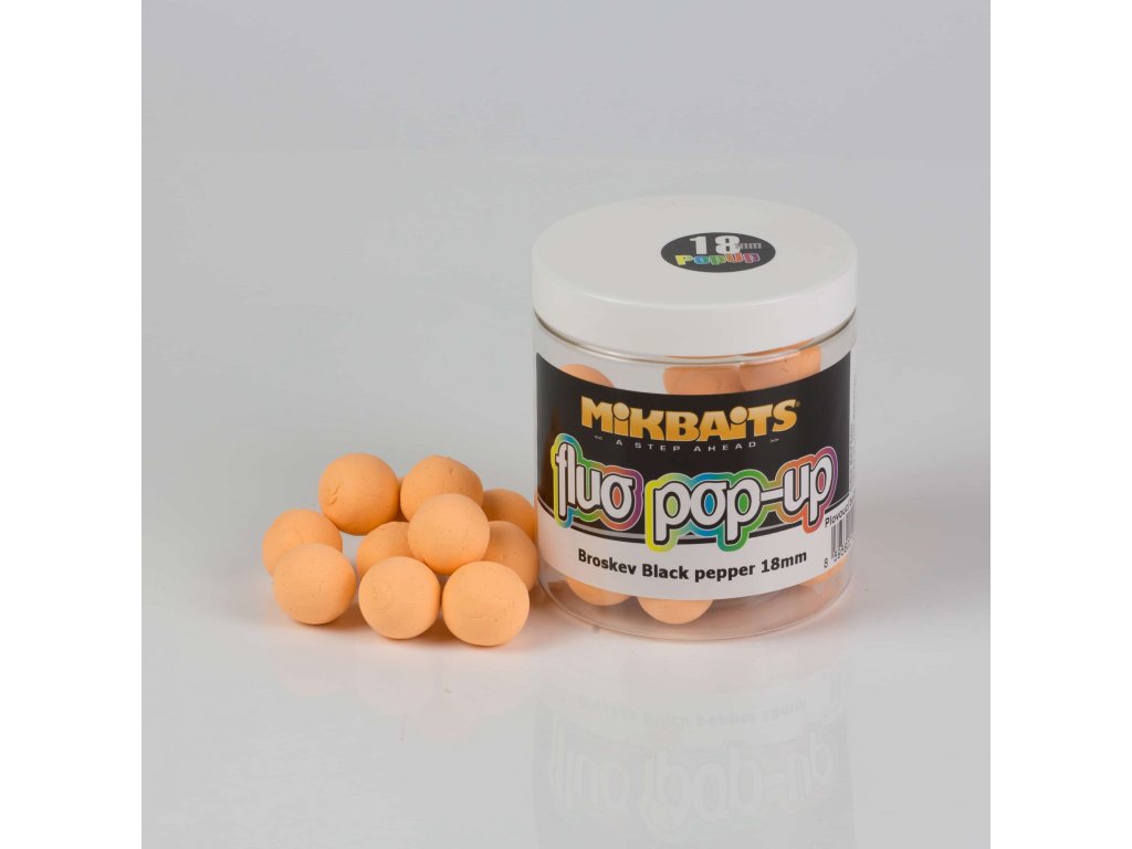Mikbaits Fluo Pop up 250ml Bros. Black Pepper 14mm - Plávajúce Fluoro boilies – Najnovšie Fluo Pop Up Boilies vyrábané zo zmesí CC MORE.