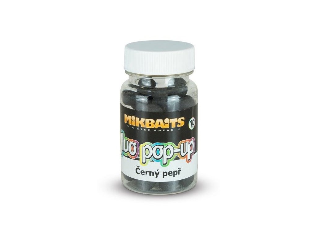 Mikbaits Fluo Pop up 60ml Čierny Peper 10mm - Sú veľmi účinnou nástrahou, použiteľnou ako samostatne, tak v kombinácii s Mirabel boilies na panáčika. Ich výrazná farba z diaľky priťahuje pozornosť rýb, silná atraktívna aróma láka k nasatiu a tým aj záberu.Fluo pop-up majú optimálnu tuhosť a dlhodobú schopnosť plávať. Všetky príchute sú použiteľné celoročne, teda aj vo veľmi chladných obdobiach. Fluo pop-up by ste nemali máčať v dipoch, zvlášť nie dlhodobo, inak by mohli stratiť plávajúce schopnosti. Pre zatraktívnenie alebo oživenie môžete krátko postriekať Pop-up sprejom. Pri nastražení taktiež ich môžete obaliť vo Fluo paste alebo pokvapkať Fluo plazmou.