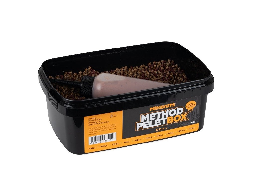 Mikbaits Method pelet box 400g + 120ml Activator Krill - Method peliet boxy sú kompletné zostavy pre chytanie na method feeder.