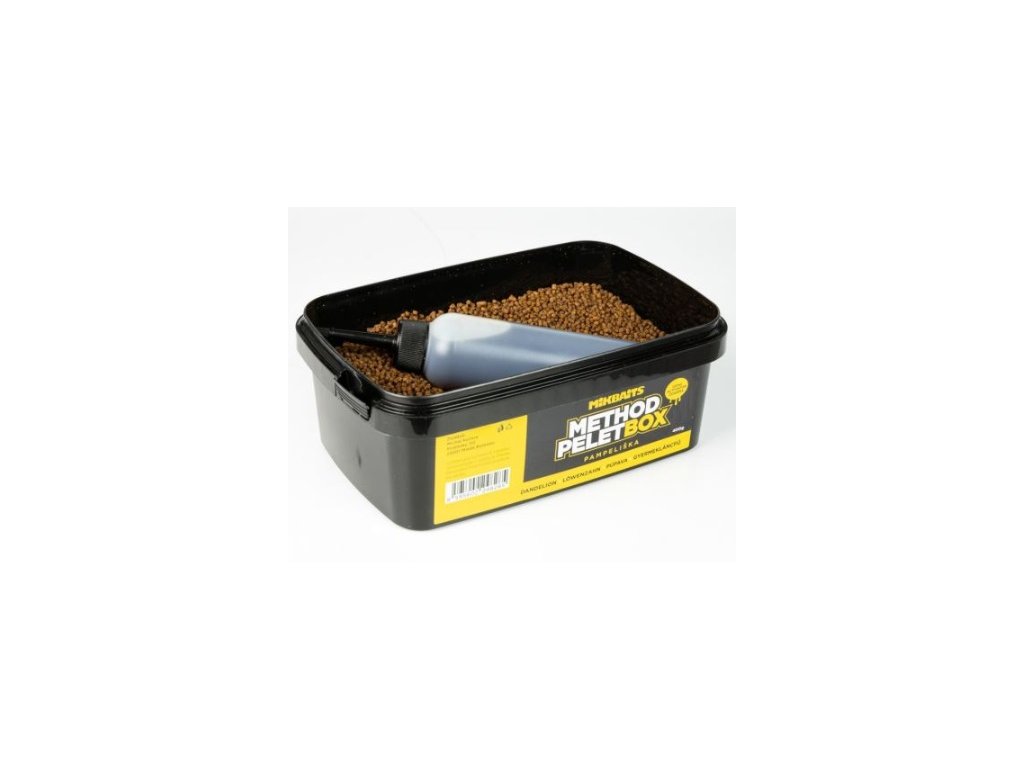 Mikbaits Method pelet box 400g + 120ml Activator Pampeliška : Method Feeder boxy boli vyvinuté a testované v spolupráci s Milanom Tychlerom. Táto návnada určená predovšetkým na stláčanie do kŕmidiel je veľmi účinná na kapry všetkých veľkostí, rovnako tak na amurov a ostatné kaprovité ryby.